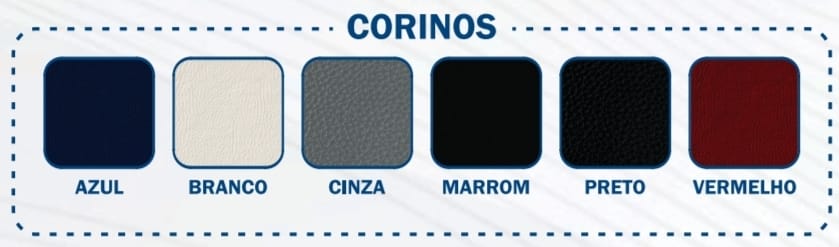 | Corino | Azul, Branco, Cinza, Marrom, Preto, Vermelho |