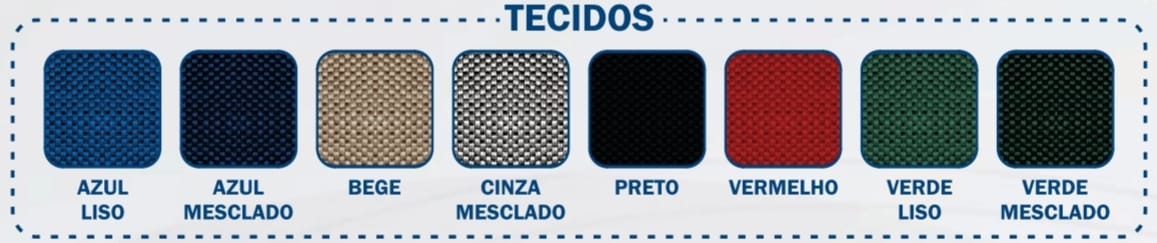 | Tecidos | Azul Liso, Azul Mesclado, Bege, Cinza Mesclado, Preto, Verde Liso, Verde Mesclado, Vermelho |